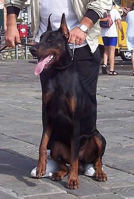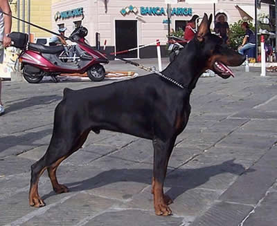 On his father side, through Ch. Victor di Casa Balestieri, we find a line breeding to Italian Ch.-AIAD Ch.-DV Jg-IDC Jg Sieger "Laerte Luger del Littorio" SchH3-ZTP1A-HD1, who gave strong fighting instinct, elegant type, and beautiful color. Also, in the back of his father line there are many Furstenfeld type Dobermann. The mother of Max's father is an in breeding on Ch. Orson v. Roveline, one of the best reproduction males in the Dobermann history. On his mother side, we find a line breeding in Ch. Indira v.d. Rauberhohle, an excellent reproduction female who contributed to the development of the new Dobermann selection in eastern Europe. Also, through Ch. Ugor di Villa Conte, the line goes back to Ch. Quarz del Littorio SchH3-ZTP1A surely contributing to the beautiful long head type and good temperament. |